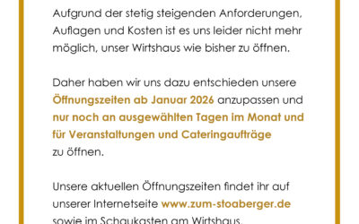 Für Reservierungen oder Anfragen erreicht ihr uns Telefonisch unter 08082/272 oder 015170236311 oder per E-Mail unter info@zum-stoaberger.de